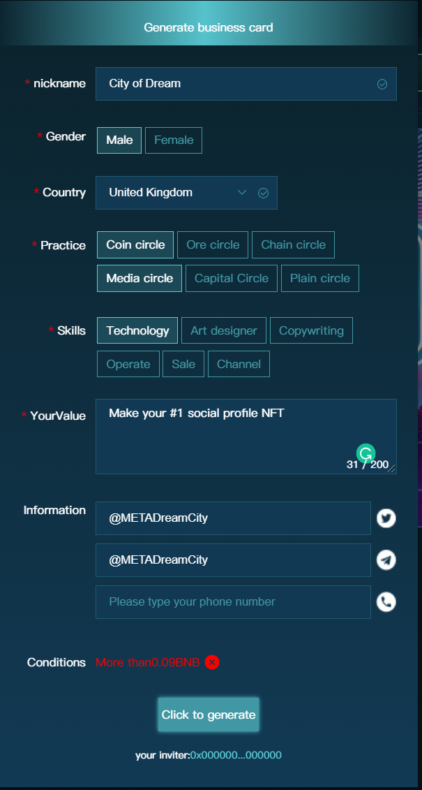 Como el contrato COD requiere que los usuarios tengan al menos 0.09 BNB en sus billeteras, antes de crear su tarjeta NFT de perfil social n.º 1, mantenga 0.09 BNB en su billetera.